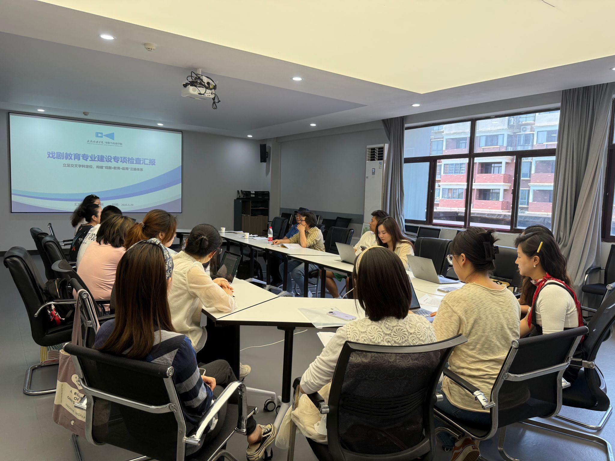 戏剧教育系主任张沅逸进行专业建设汇报。她介绍,专业以培养“戏剧 + 教育 + 数字化”复合型人才为目标,聚焦中小学教育、社区公共事务等领域,特色在于将 “应用戏剧” 与数字化传播相结合,区别于传统师范类戏剧教育。目前,专业拥有专任教师 15 人,外聘教师 1 人,课程体系涵盖心理基础课、技能课与跨学科综合课。