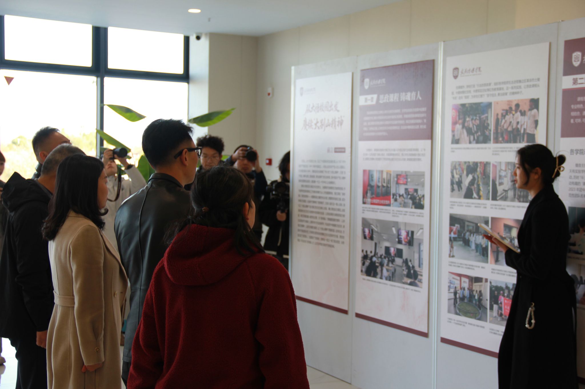 活动伊始,与会领导共同参观了位于校区图书馆一层的“从大悟出发——赓续大别山精神”主题展。该展览由校党委宣传部深度策划内容、设计学院倾力打造空间,以“课程铸魂、实践创作、社会传播”为清晰脉络,全面展现我校在红色文化教育中的探索与实践。在“思政课程 铸魂育人”板块,“课堂教学+实践研学”的双轨模式格外引人注目,生动展现思政教育从书本走向现场、从理论落地实践的创新路径;“课程思政 融合共进”板块则聚焦各学院专业特色,呈现挖掘课程红色元素、实现“学专业、传红色、育新人”的融合实践;“弘扬成果 精神远扬”板块记录了学校联合地方政府与兄弟院校,推动红色文化成果从“校园创作”走向“社会传播”的坚实步伐。整场展览以“红色传承·青春担当”为核心,引导师生更深刻地理解红色文化的时代价值,更坚定地扛起“为党育人、为国育才”的使命,培养出一批又一批“政治坚定、业务精湛、作风优良”的传媒人才,让红色声音在新时代持续回响。