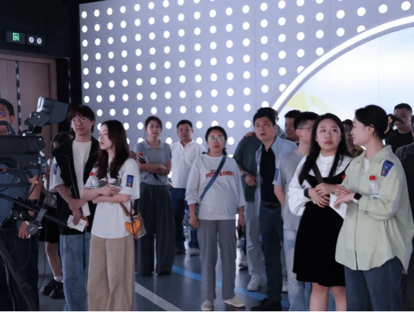 结束戏剧与光影体验后,在瞿文妍老师引导下,嘉宾前往六号楼,先后参观演播厅、直播导播间、虚拟演播厅等专业实训场地。瞿文妍老师介绍,这些设备先进、功能齐全的实训场地,是学生日常学习和实践的核心阵地,曾完成湖北省电商直播大赛总决赛等重要活动直播,为学子搭建了理论与实践结合的平台。随后,嘉宾移步五楼视频制作中心,参观影视后期、数字调色、影视特效等实验室,了解到实验室配备行业标准设备,为影视创作和技术研发提供坚实支撑。在六楼音频后期制作中心,嘉宾参观了对白录音棚、拟音实验室等专业场地,直观感受学院在传媒实训领域的雄厚实力。