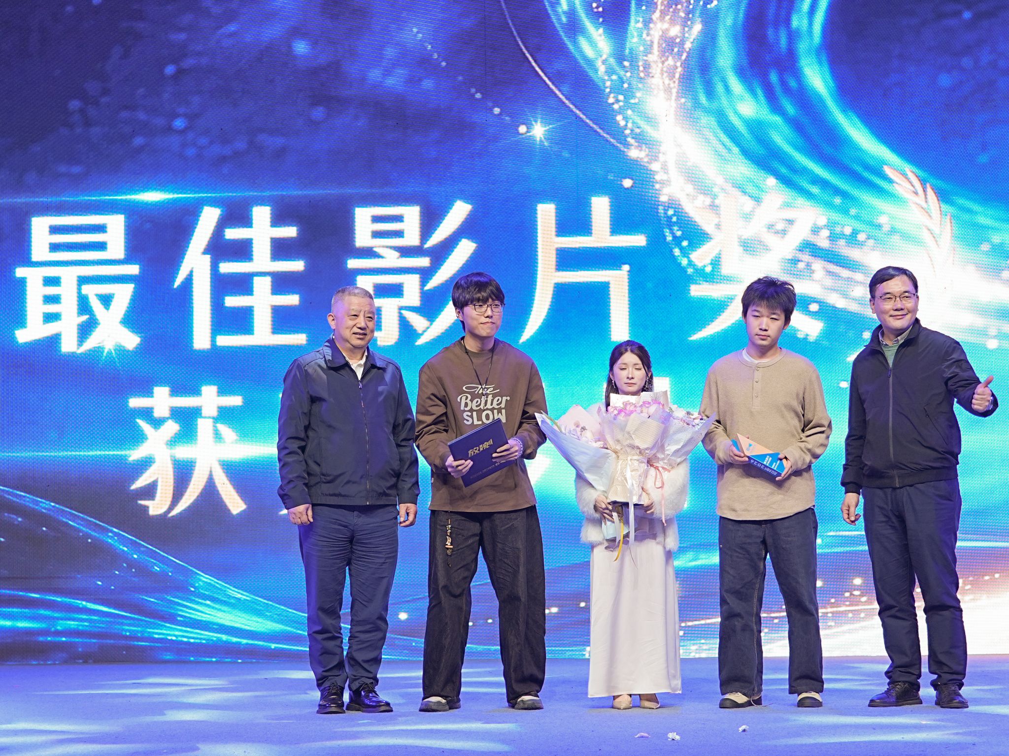武汉传媒学院校长王爱民、湖北长江云新媒体集团董事长朱昊共同颁发最佳影片奖,《一只鬼的生活意见》摘得桂冠。王爱民校长表示,打动观众、呼应时代是优秀影片的核心;朱昊董事长寄语学子,坚持内容为王、适配传播规律,让优质影像被更多人看见。