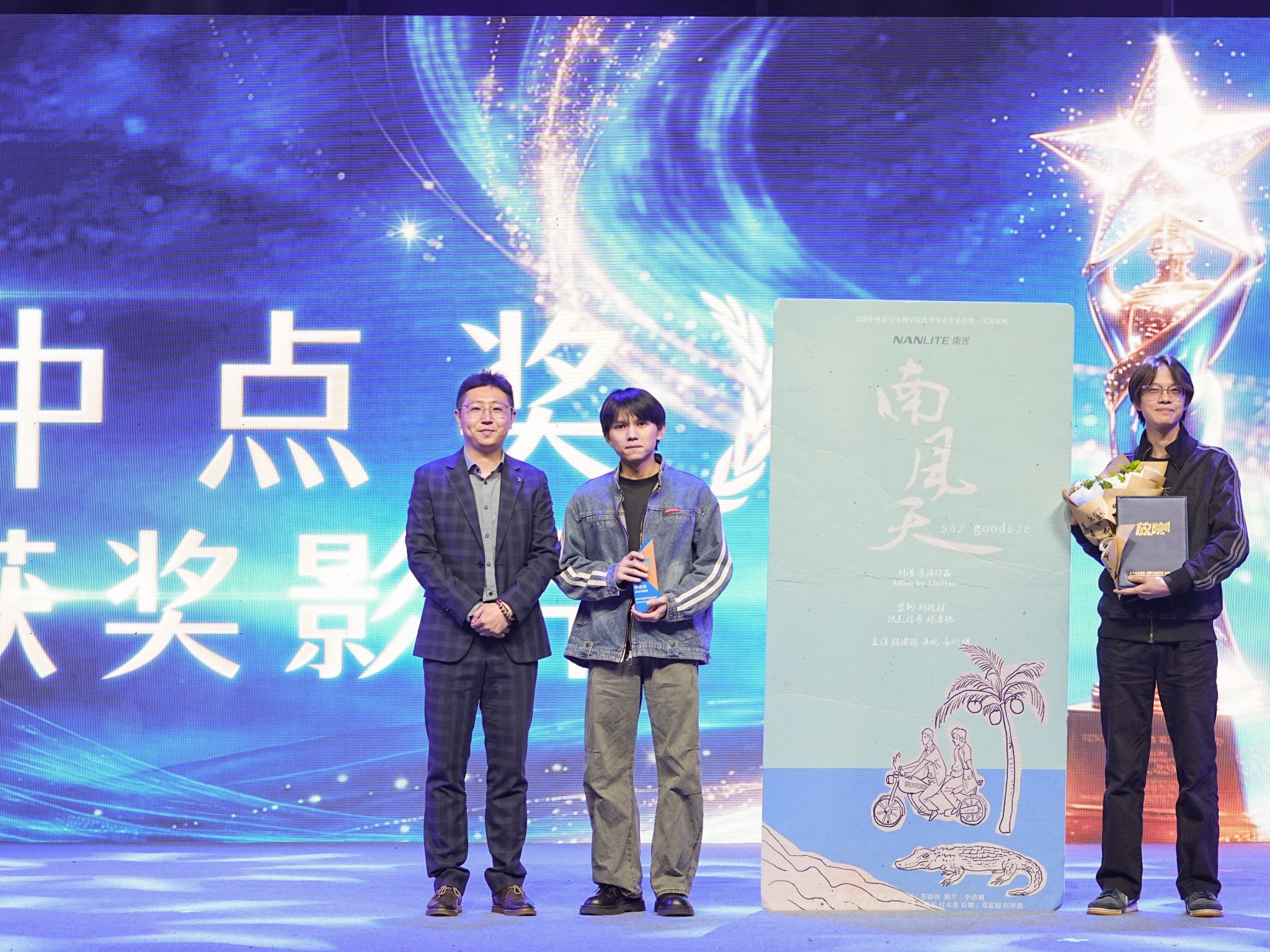 学院党总支书记、副院长陈磊颁发特色奖项中点奖,该奖项源于 2016 届优秀毕业生康成业作品《中点旅社》,寓意创作精神的传承与新征程的起点,获奖作品《南风天》以南方气候为载体,用情绪叙事打动观众。