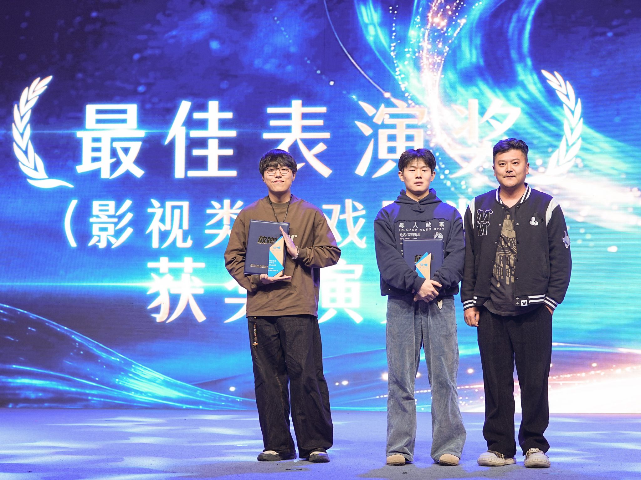 第三轮颁奖重磅开启,表演系主任于昊颁发最佳表演奖,影视类获奖者夏寅都(《一只鬼的生活意见》)、戏剧类获奖者侯宇晨(《王二的长征》)凭借真挚表演获奖。