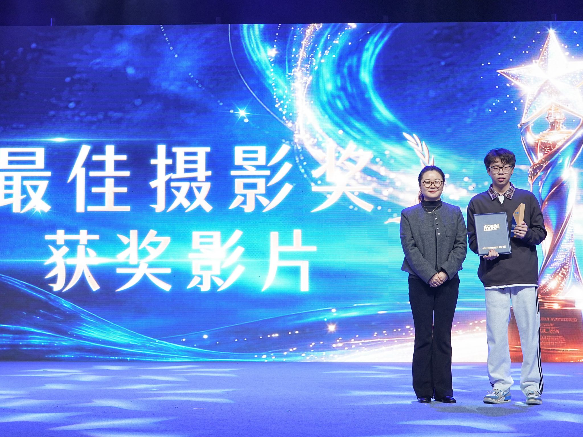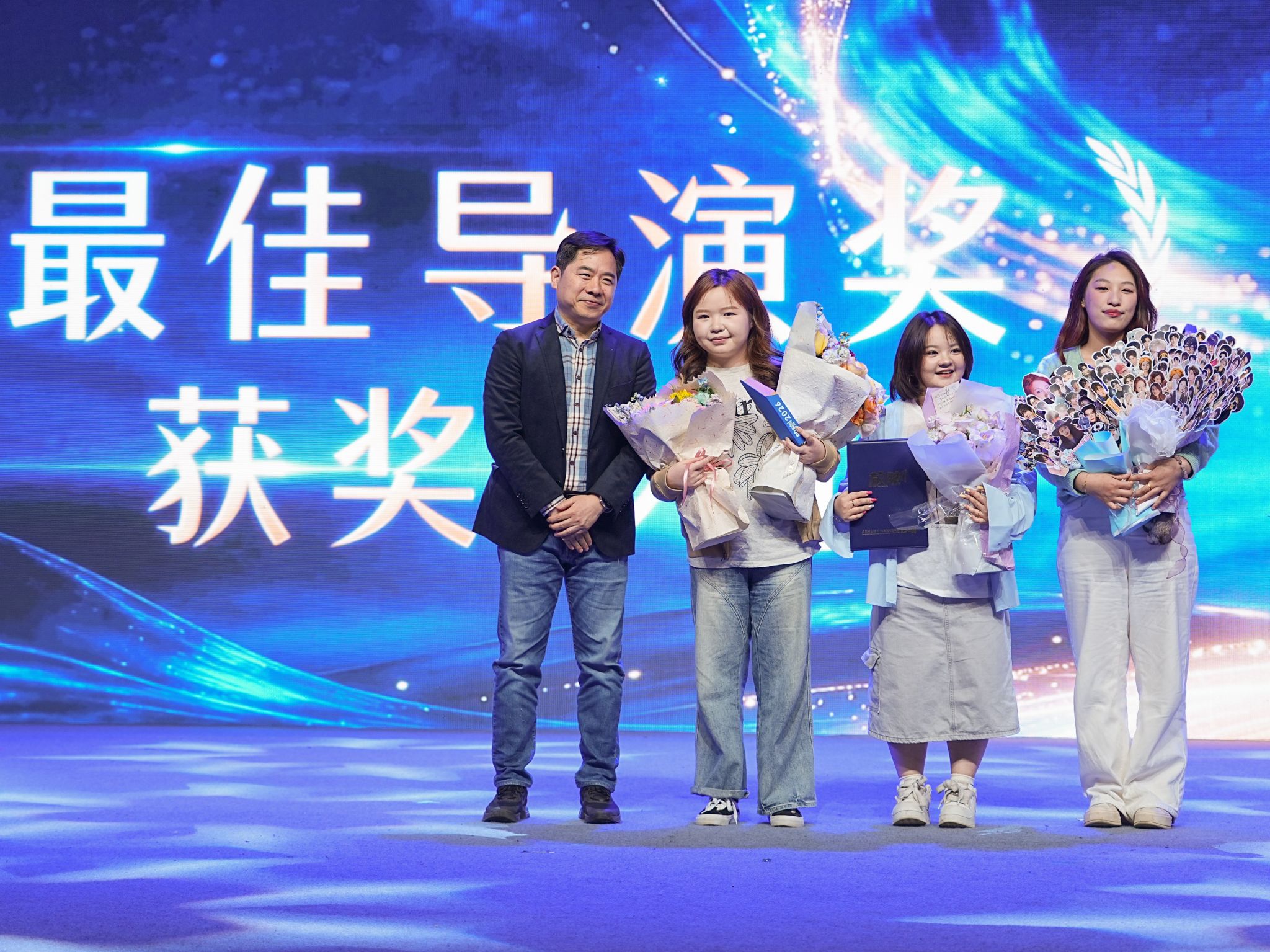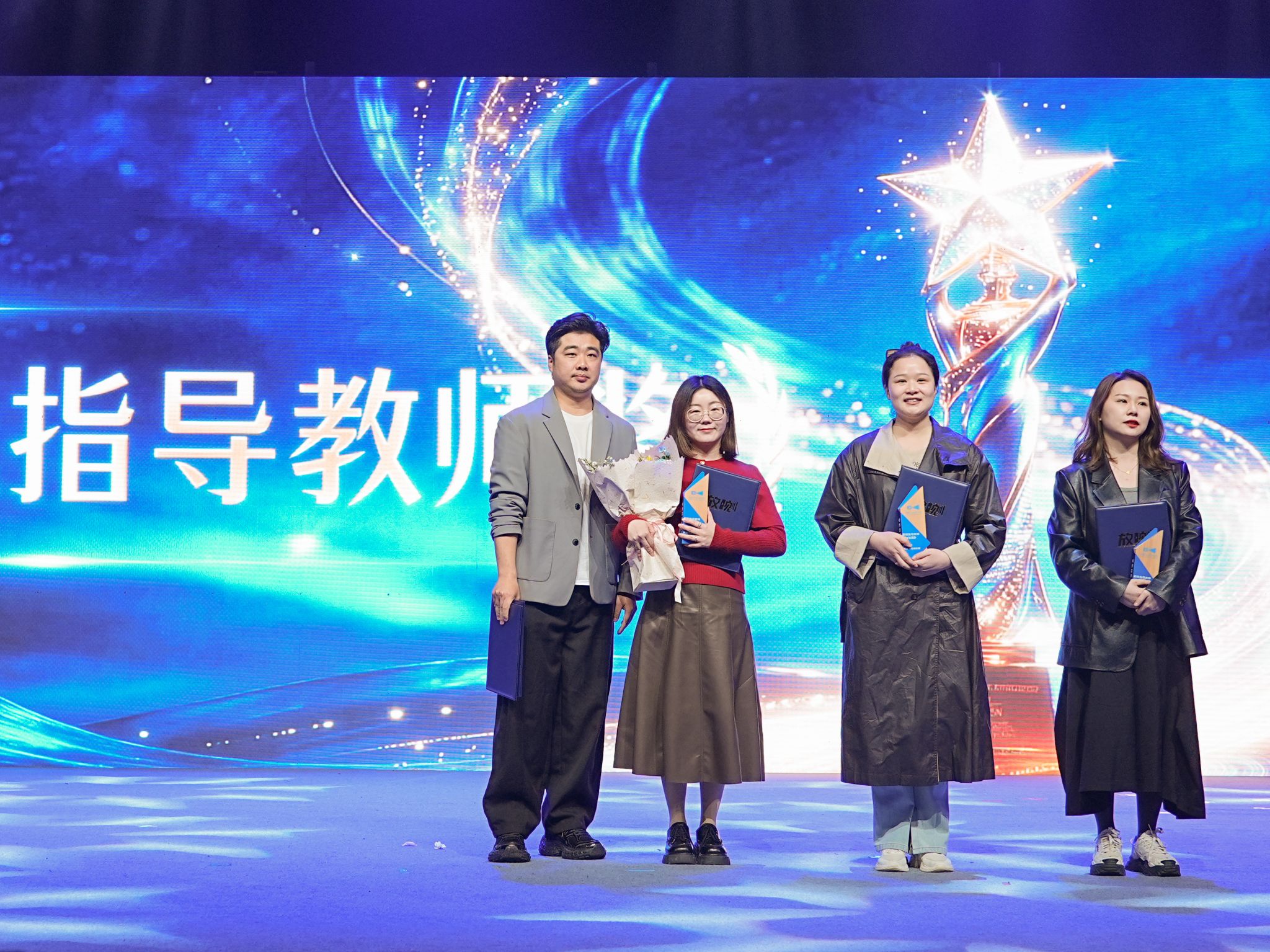 学院院长助理张程颁发新锐指导教师奖,杜茹婷、刘寒、余晗影、王玲、钱雨彤五位教师获此殊荣。张程老师介绍,奖项由“优秀指导教师”更名而来,旨在激励青年教师成长,彰显学院十年师资梯队建设成效。余晗影老师表示,无论是“优秀”还是“新锐”,都是前行的动力,指导学生创作时,重在助力学生突破心理障碍、坚定创作方向,敢于触碰社会议题、展现青年担当。