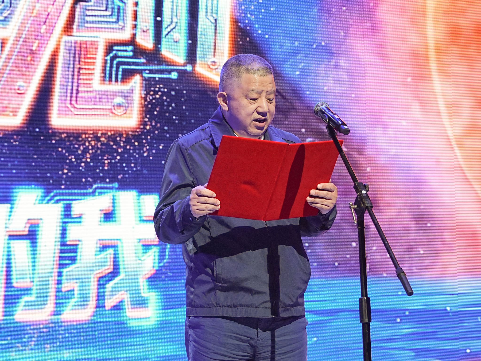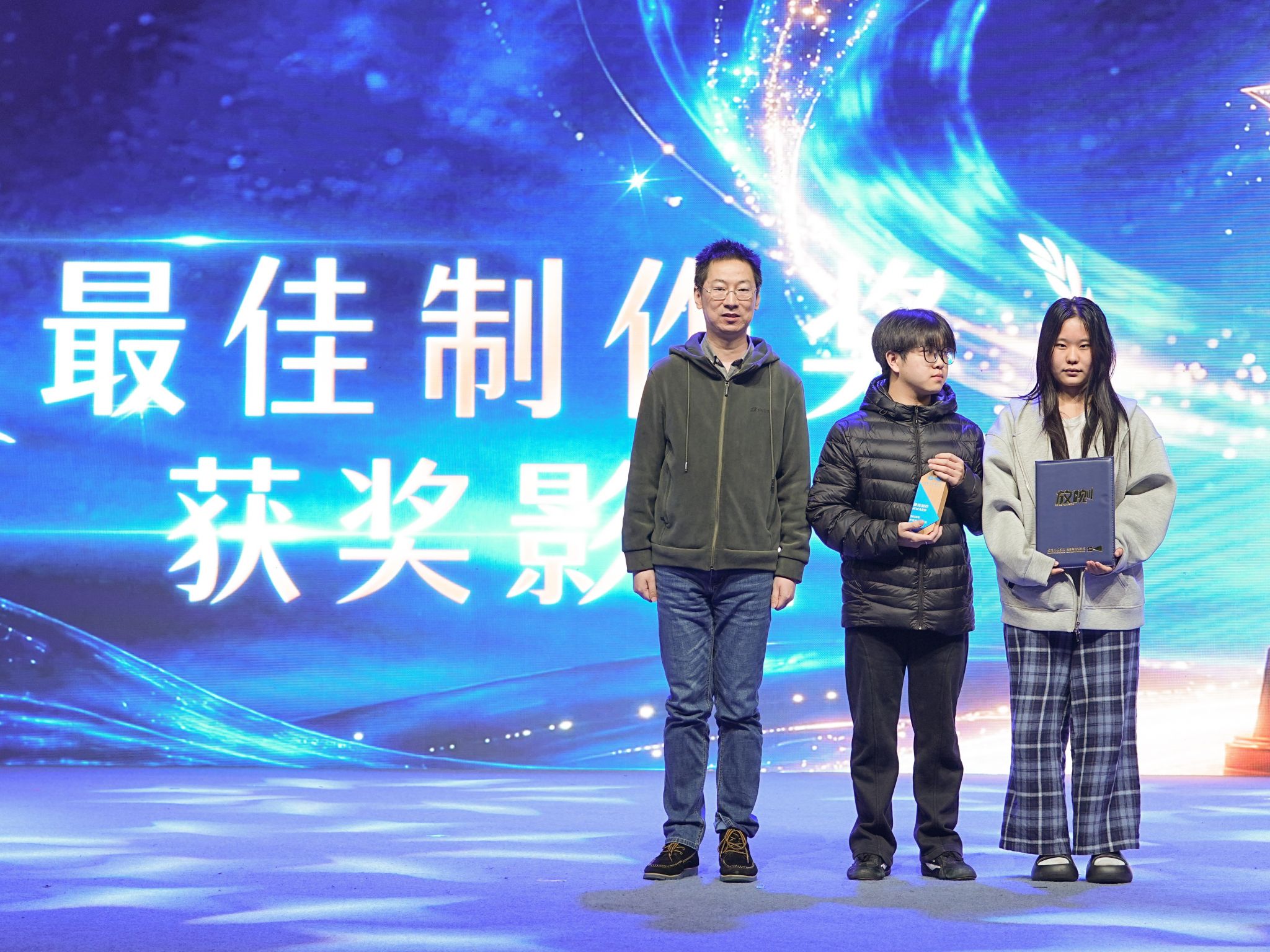 传媒技术学院人工智能教研组项目负责人罗鸿苍为最佳制作奖获奖作品《深空灯塔》颁奖,他指出,AI 技术赋能影视创作,降低了创作门槛,但创意、温度与人性表达,始终是创作者不可替代的核心竞争力。