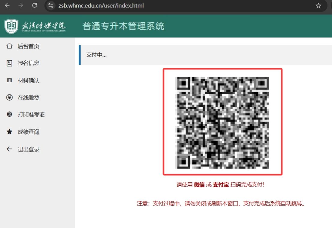 上传后的材料,由学校老师逐一进行审核,通过后可在线缴费。点击“在线缴费”菜单,系统显示用户信息、缴费金额等,核实无误后点击“在线支付”按钮,系统弹出支付二维码,使用微信或支付宝扫码支付,支付成功后系统自动跳转到缴费详情页面。