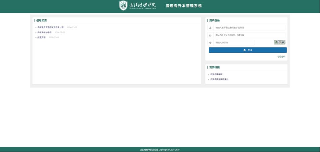 武汉传媒学院专升本管理系统网址:https://zsb.whmc.edu.cn