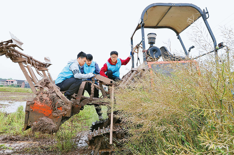 图为2023年4月29日,南华大学的大学生志愿者利用五一假期到湖南省衡阳市衡阳县西渡镇新桥村开展劳动助农行动,帮助农民检修、保养农机,用劳动实践助力乡村振兴。